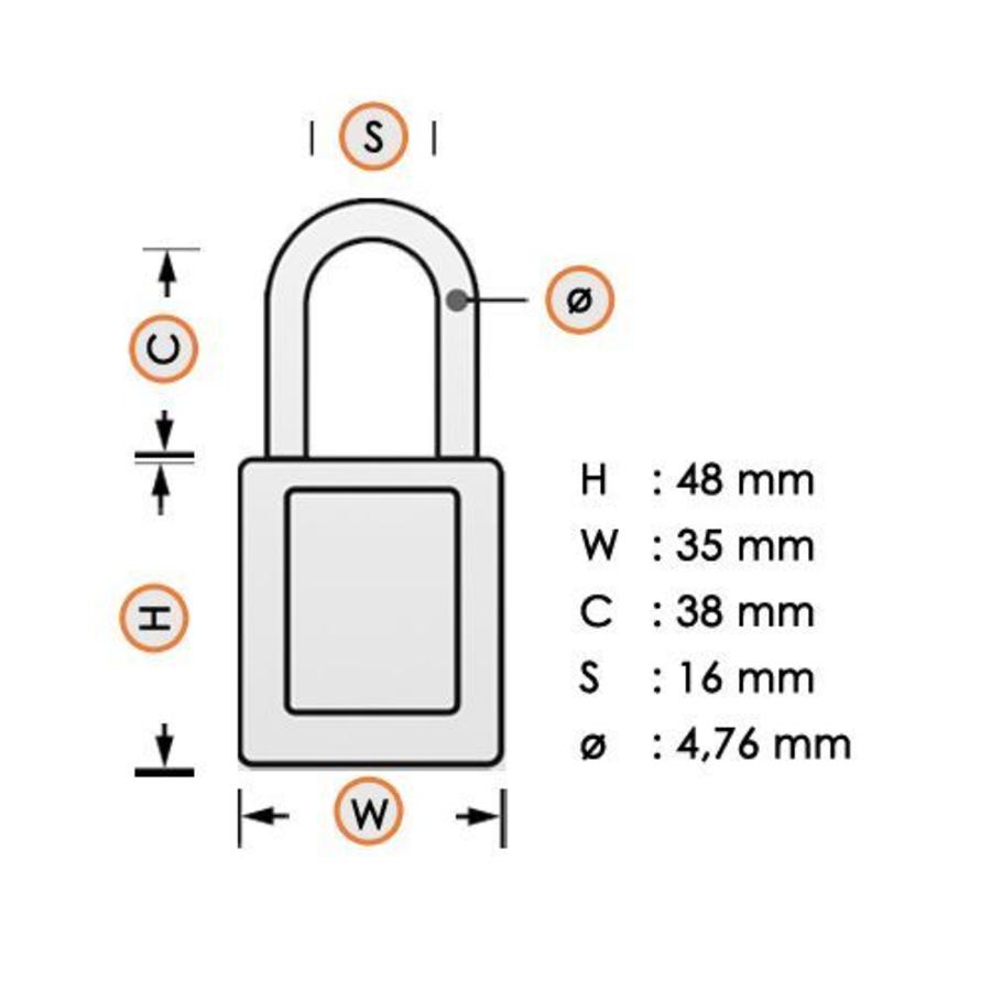 Chemical resistant: Yes Shackle height: 38 mm Shackle diameter: 4.76 mm Temperature range: -57 °C to +177 °C Body material: Zenex composite Lock mechanism: Non Key retained Corrosion resistant: Yes ATEX-certified: Zone 2 UV-stable: Yes Shackle material: Nylon Master-keyed possible: Yes (optional) Padlock labels: “Danger” and “Property of” included in French, English and Spanish Pull strenght resistance: 114 Kg Supplied keys: 1 (OSHA Standard) Complies with OSHA regulations: Yes Laser engraving possible: Yes (optional) Key charting service: Yes (optional) Non-magnetic padlock: Yes Silicone free: Yes Key systems: Keyed different or keyed alike -
