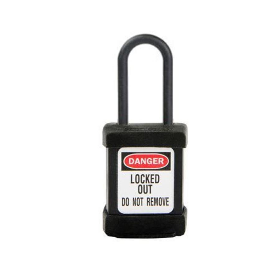 Light-weight (85gr) Zenex composite safety padlock black with a (4.76mm) nylon shackle.