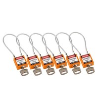 6 Pack Compact Nylon safety padlock orange with (4mm Ø) PVC encased steel cable.