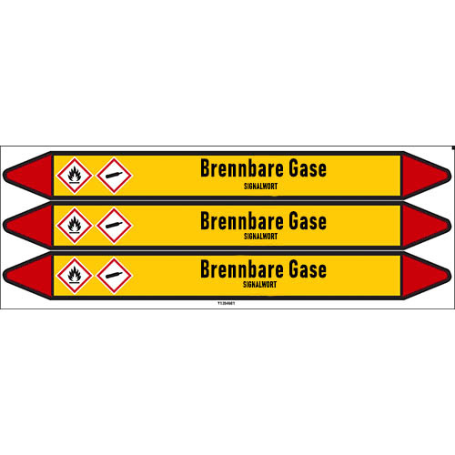 Pipe markers for Dimethylether in German with legend and text. Category: Flammable gas.