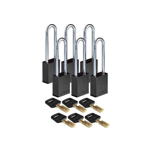 3-pack SafeKey aluminium safety padlock black with a (Ø6,40mm, H 76mm) hardened steel shackle and key retaining function. All keyed alike.