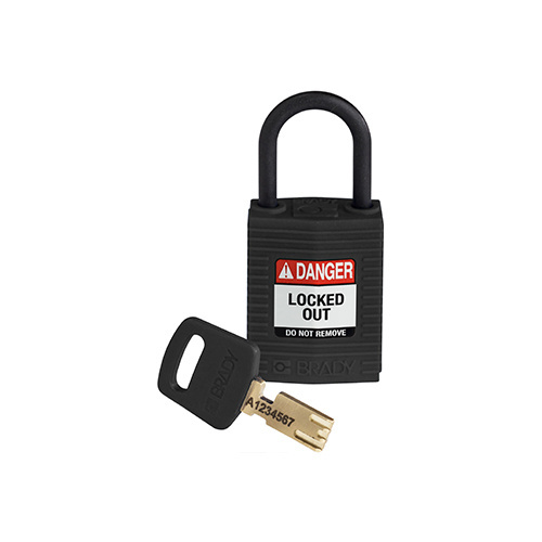 Chemical resistant: Yes Shackle height: 25 mm Shackle diameter: 4,70 mm Temperature range: -34 °C to +121 °C Body material: Nylon Lock mechanism: Key retained Corrosion resistant: Yes ATEX-certified: - UV-stable: No Shackle material: Nylon Master-keyed possible: Yes Padlock labels: “Danger” "Locked out” included Pull strenght resistance: 80 Kg Supplied keys: 1 (OSHA Standard) Complies with OSHA regulations: Yes (OSHA 29 CFR 1910.147) Laser engraving possible: Yes, on front, back, left side, right side and key Key charting service: Yes (against surcharge and on request) Non-magnetic padlock: Yes Silicone free: No Key systems: Keyed different and keyed alike -