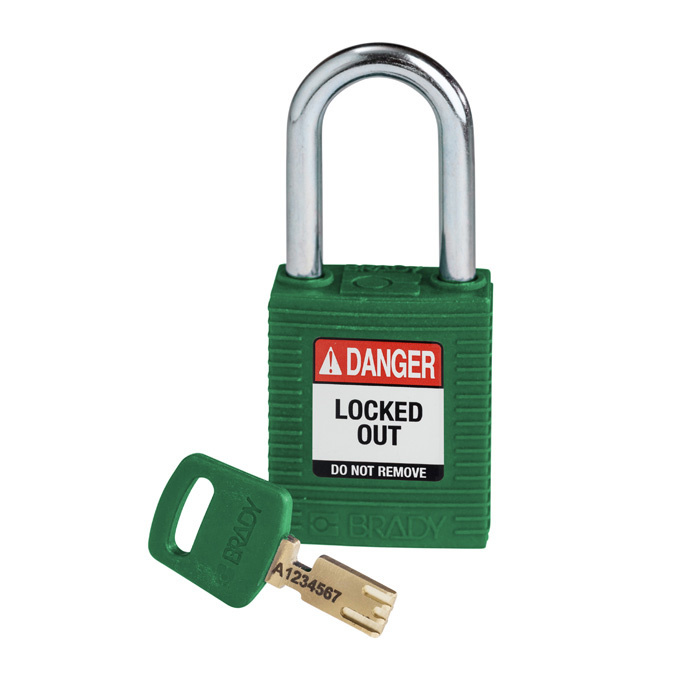 Chemical resistant: Yes Shackle height: 38 mm Shackle diameter: 6,40 mm Temperature range: -34 °C to +121 °C Body material: Nylon Lock mechanism: Key retained Corrosion resistant: Yes ATEX-certified: - UV-stable: No Shackle material: Hardened steel Master-keyed possible: Yes Padlock labels: “Danger” "Locked out” included Pull strenght resistance: 80 Kg Supplied keys: 1 (OSHA Standard) Complies with OSHA regulations: Yes (OSHA 29 CFR 1910.147) Laser engraving possible: Yes, on front, back, left side, right side and key Key charting service: Yes (against surcharge and on request) Non-magnetic padlock: Yes Silicone free: No Key systems: Keyed different and keyed alike -