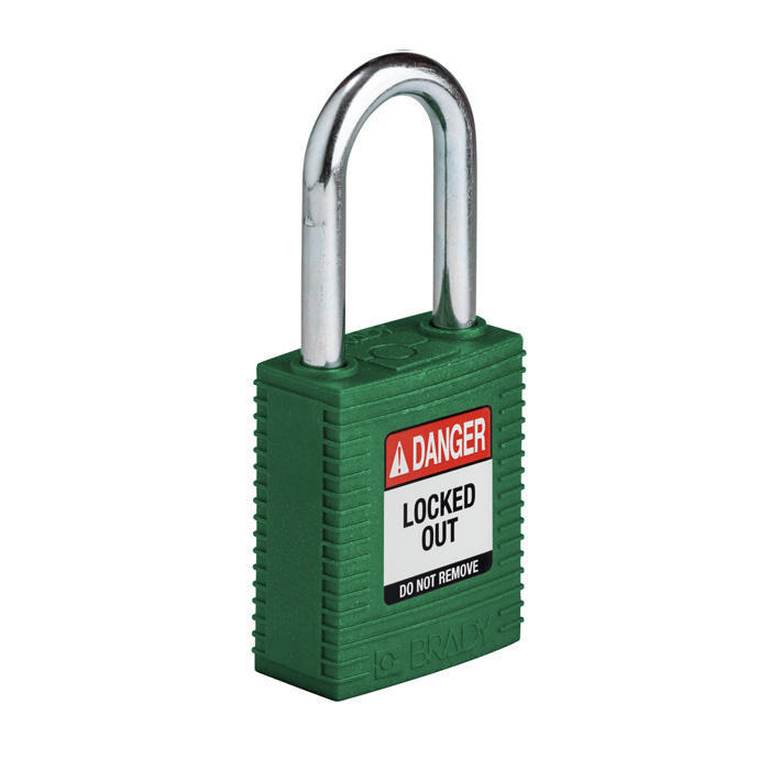 Nylon safety padlock green with a (Ø6.40mm, 38mm) hardened steel shackle.