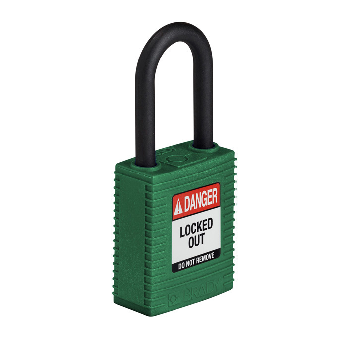Nylon safety padlock green with a (Ø6.40mm, 38mm) nylon shackle.
